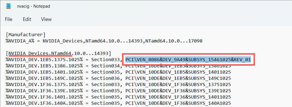 - Scroll down the Notepad to the section that begins with NVIDIA_Devices.NTamd64. Replace the snippet of text that begins with PCIVEN_ on the first line with what you copied to your clipboard—highlight and press Ctrl + V.