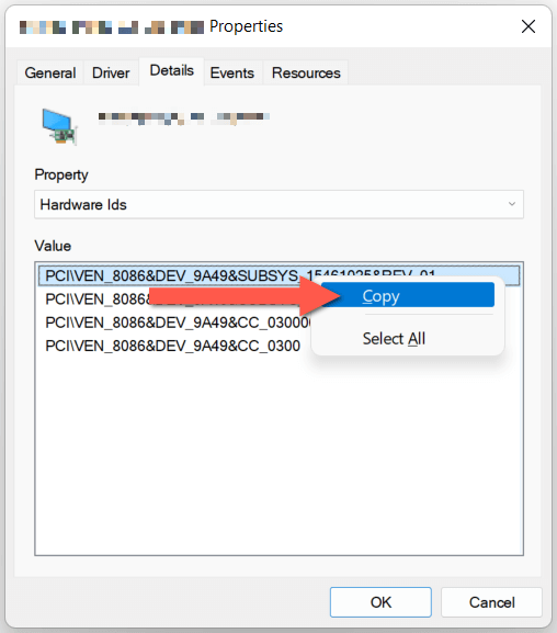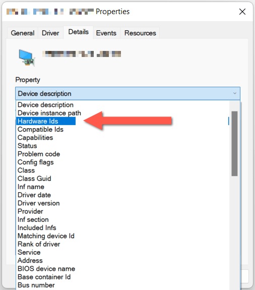- Switch to the Details tab, open the drop-down menu under Property, and select Hardware Ids.