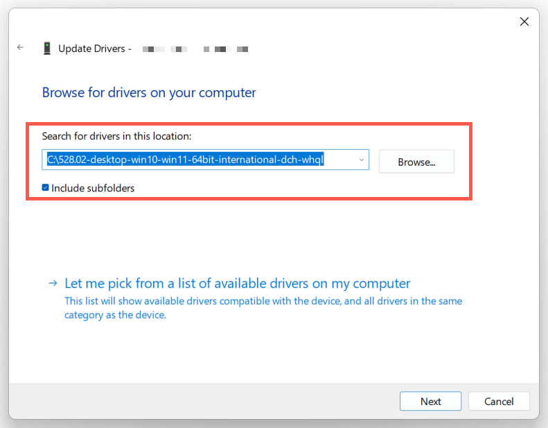 - Check the box next to Include subfolders. Then, choose the Browse button and select the extracted NVIDIA folder on your computer.