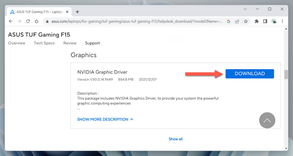 If you use a laptop device with an NVIDIA graphics card, such as an ASUS TUF Gaming F15, using graphics drivers directly from the manufacturer could help avoid compatibility issues.