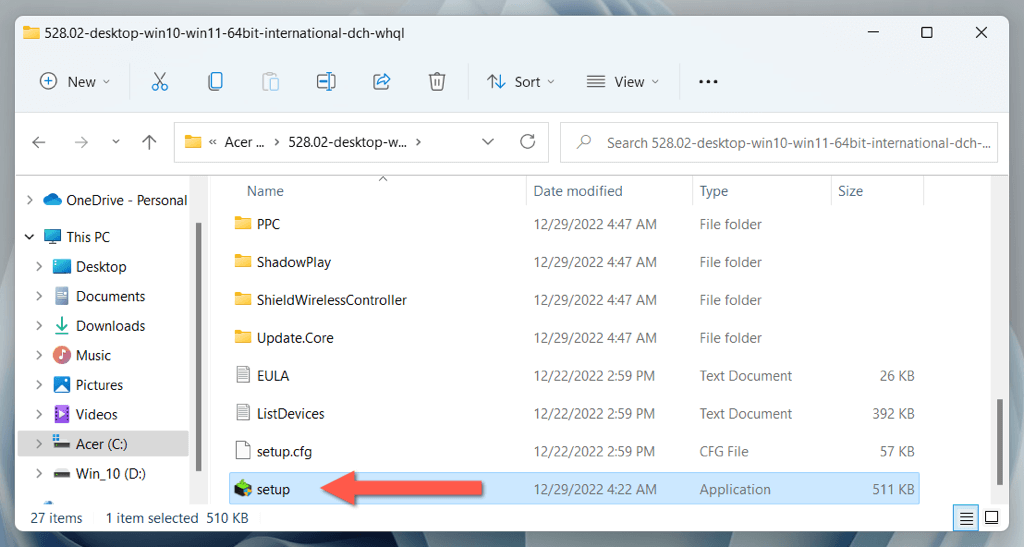 - Head back to the main NVIDIA driver folder and double-click the Setup file.