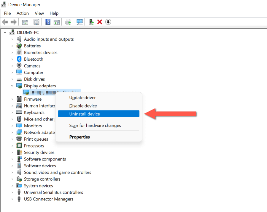 - Open Device Manager, expand Display adapters, and select Uninstall device after right-clicking your NVIDIA graphics card.