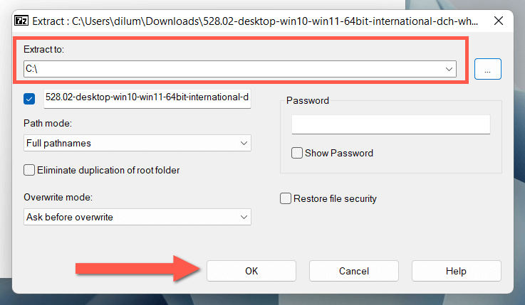 - Specify an extraction location—e.g., the root of the C drive—and select OK. Wait until 7-Zip extracts the contents of the NVIDIA installer.