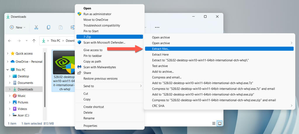 - Visit your computer’s Downloads folder, right-click the NVIDIA installer, and select 7-Zip > Extract files.
