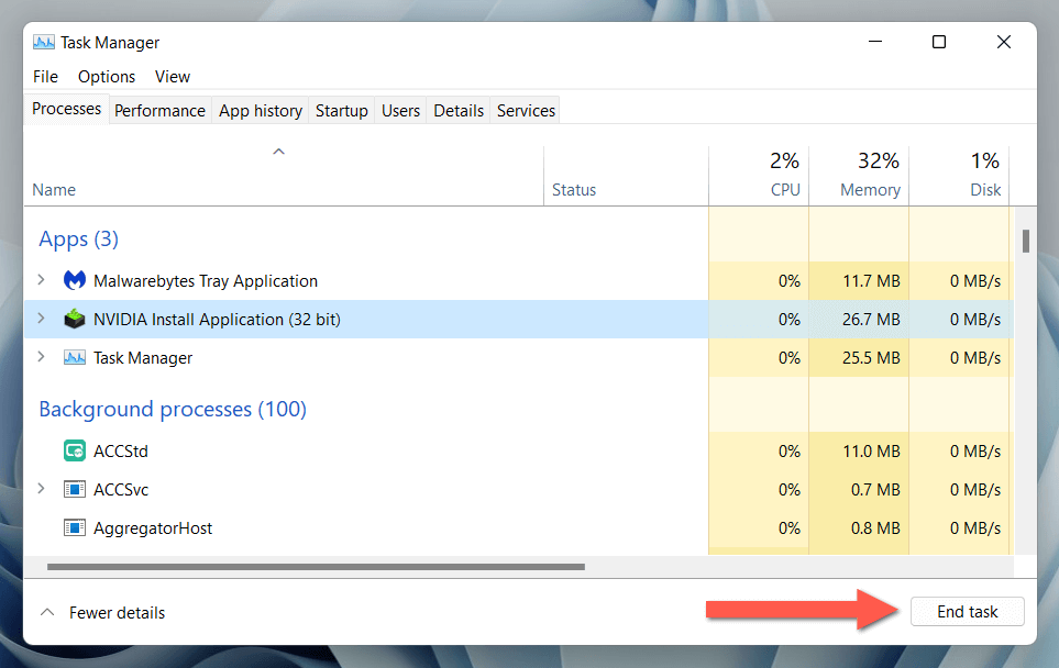 - Select More details to expand the Task Manager. * Locate and select an NVIDIA process under the Apps and Background processes sections of the Processes tab. * Select End task.