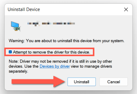 - Check the box next to Attempt to remove the driver for this device and select Uninstall.