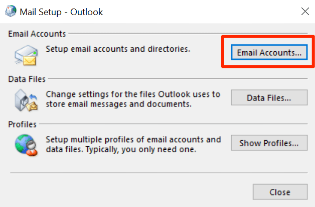 - A box will appear on your screen. Click on the button that says Email Accounts to view your accounts.