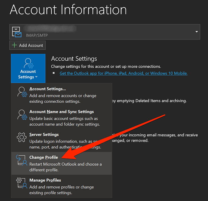 - Head back to the File menu in Outlook and click on Account Settings. This time, choose the option that says Change Profile.