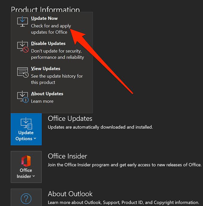 - You’ll see several options on the right-hand side pane. Select the one that says Update Options and choose Update Now.
