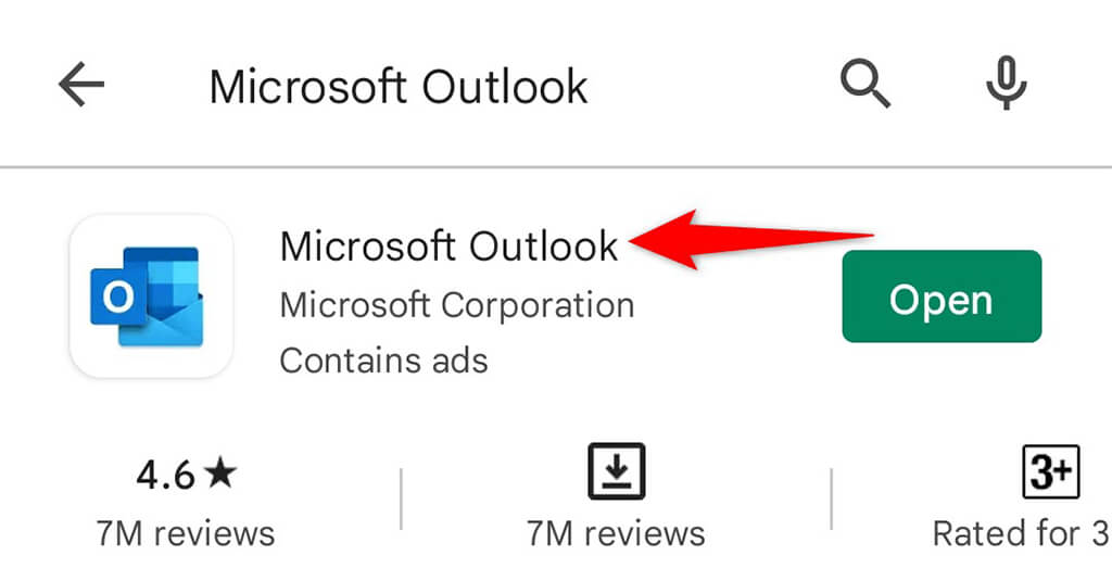 - Choose **OK** in the prompt to uninstall the app. * Open **Google Play Store**, search for **Microsoft Outlook**, and tap **Microsoft Outlook**.
