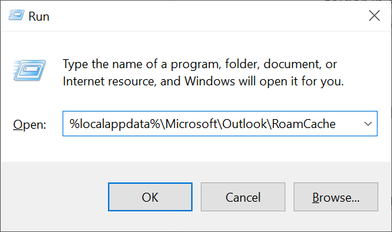 - Type the following path in Run and press Enter. This launches Outlook’s cache folder in File Explorer: %localappdata%MicrosoftOutlookRoamCache