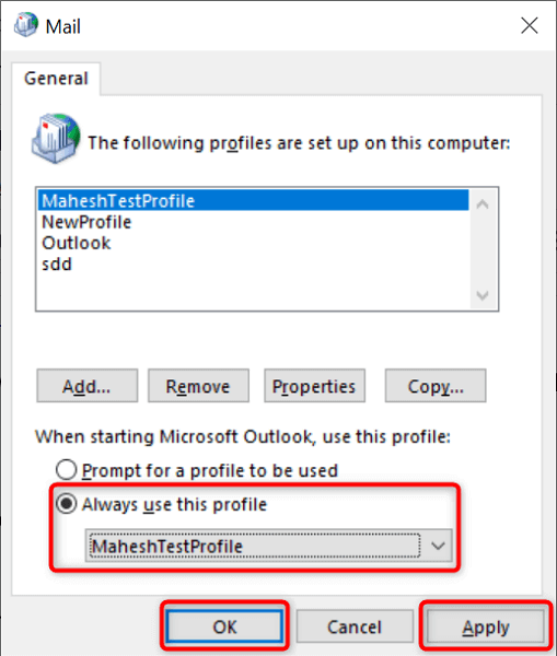 - Enter a name for your profile in the **Profile Name** field and select **OK**. * Add your email account to the newly created profile using the **Add Account** window. * Back on the **Mail** window, choose your newly created profile from the **Always use this profile** drop-down menu and select **Apply** followed by **OK**.