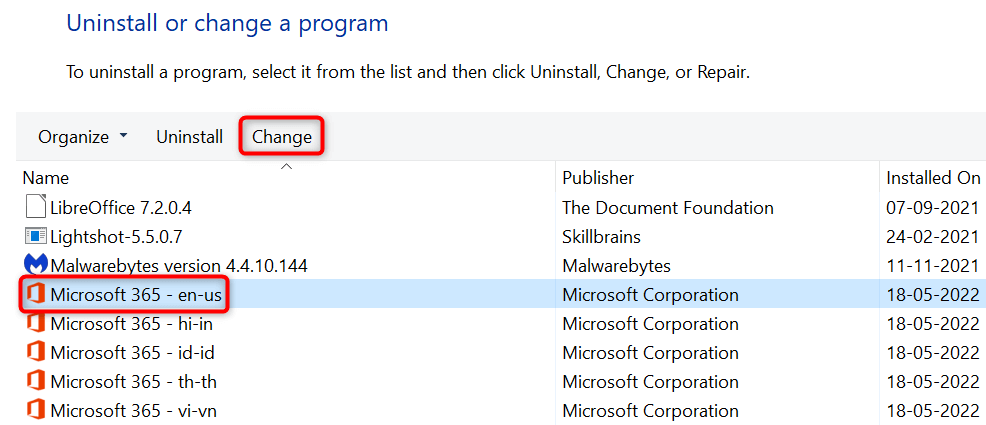 - Select your Microsoft Office version on the list and choose Change at the top.