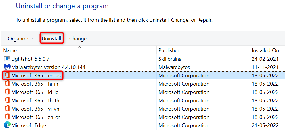 - Select your Microsoft Office version on the list and choose Uninstall at the top.
