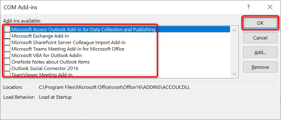 - Open the item you had trouble opening in Outlook. * If your item opens, access the **COM Add-ins** box and enable one add-in at a time. This will help you find the problematic add-in. * Once you know the add-in causing the issue, remove that item by selecting **Remove** in the **COM Add-ins** box.