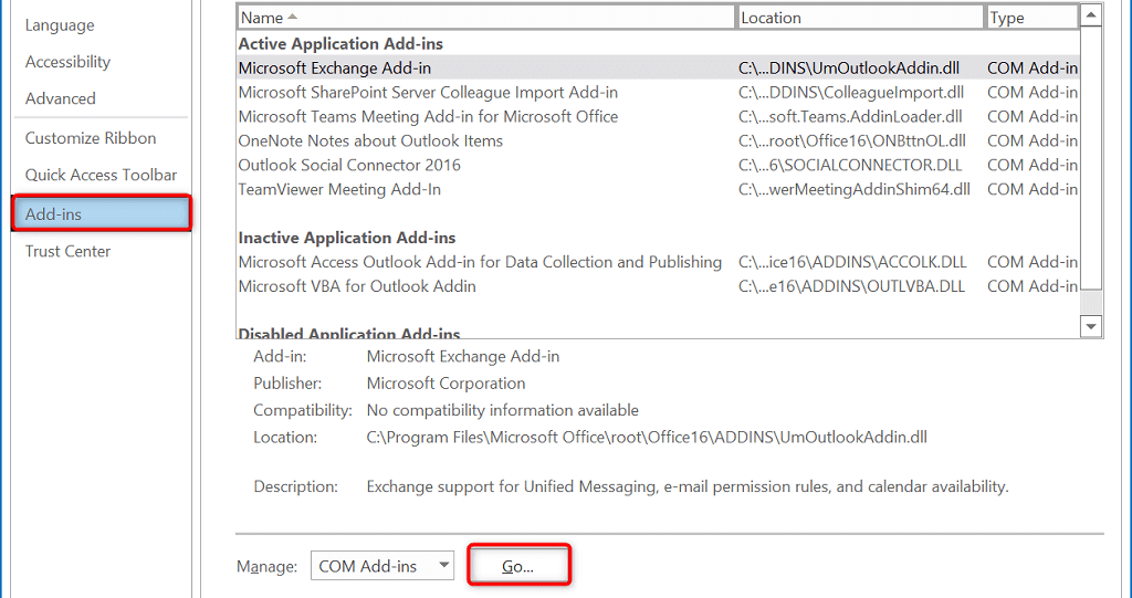 - Select Add-ins in the left sidebar and choose Go next to COM Add-ins on the right.