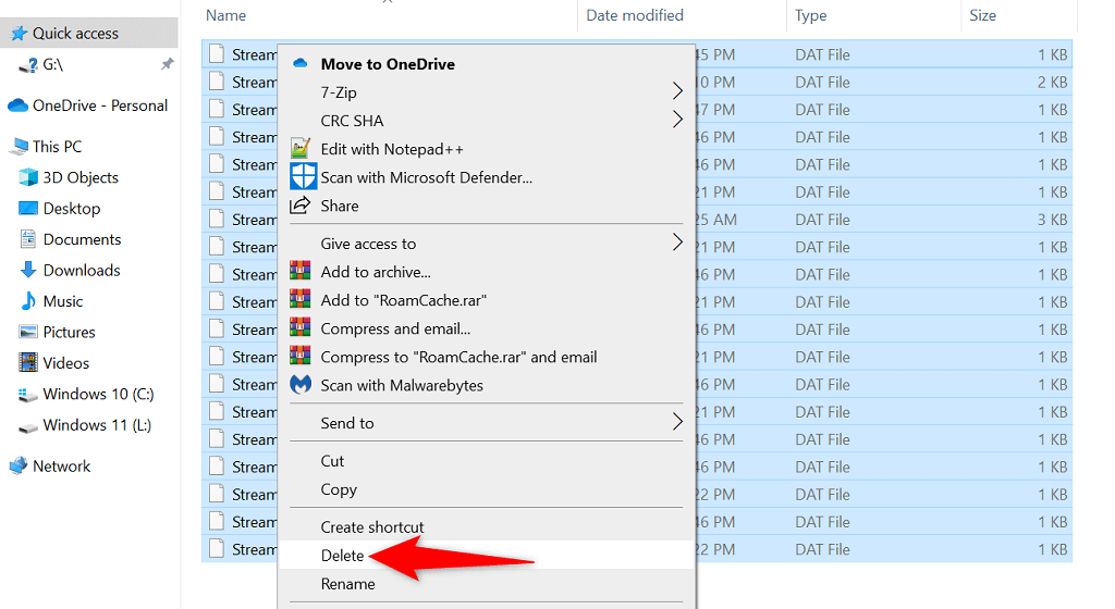 - Select all cache files in the folder by pressing **Ctrl** + **A**. * Delete all selected files by right-clicking one file and choosing **Delete** in the menu.