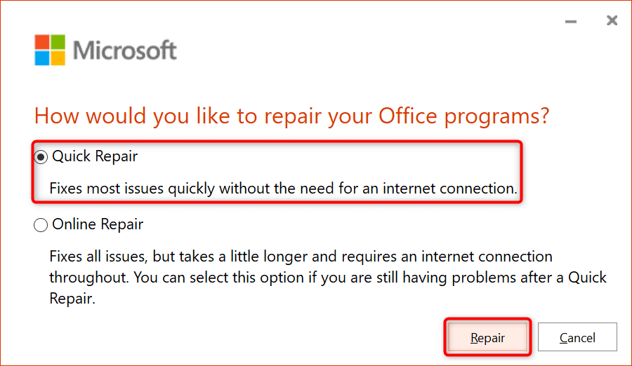 - Select **Yes** in the **User Account Control** prompt. * Enable the **Quick Repair** option and select **Repair**.