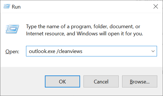 - Enter the following command in Run and press Enter to reset Outlook’s viewing pane settings: outlook.exe /cleanviews