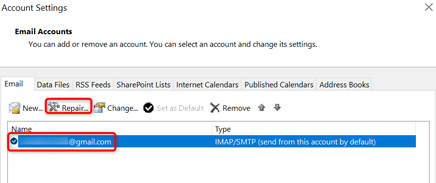 - Select your email account in the **Email** tab and choose **Repair**.