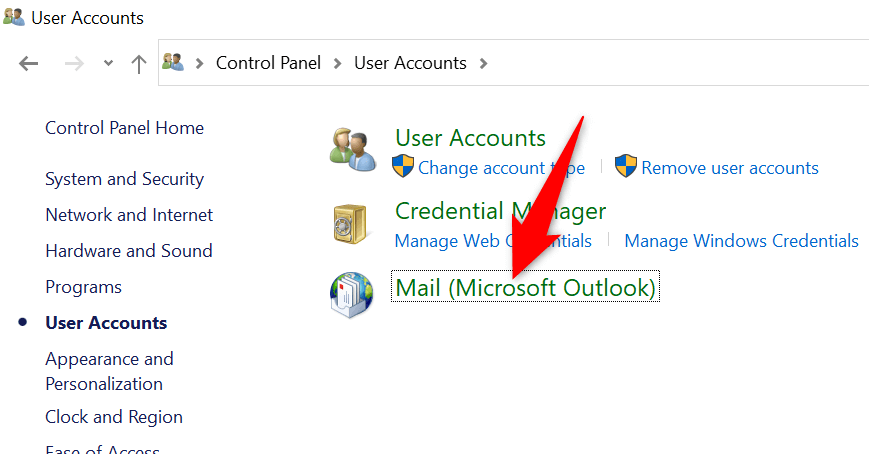 - Choose User Accounts followed by Mail (Microsoft Outlook) in the Control Panel.