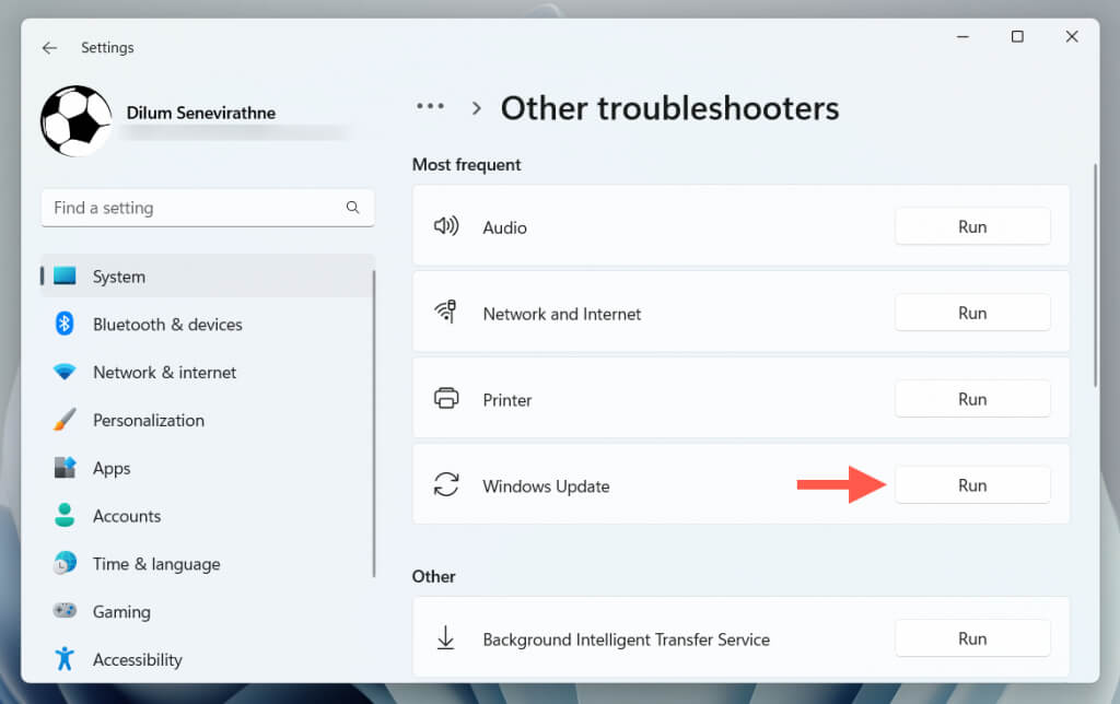 - Select Run next to Windows Update.