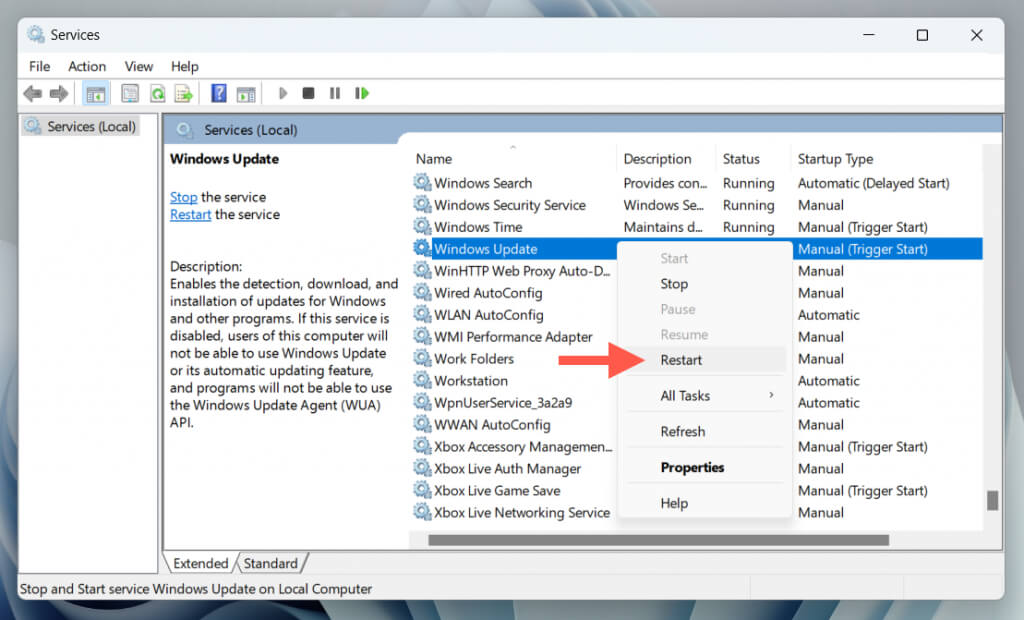 - Scroll down the Services app and right-click Windows Update.