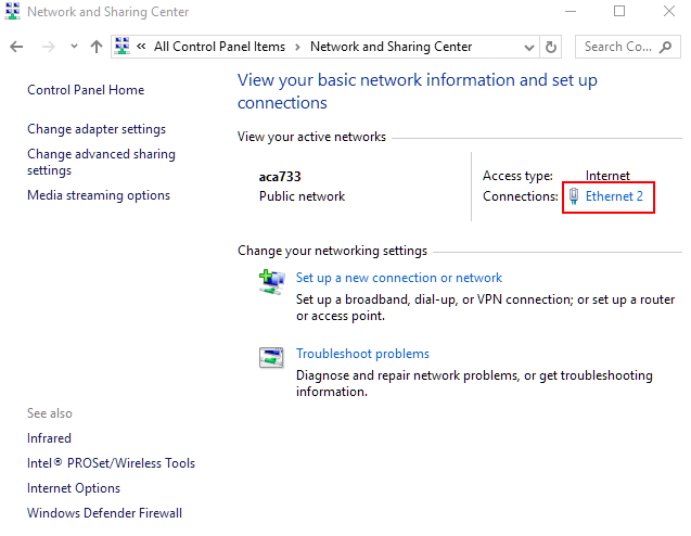 - Click the Ethernet link located next to Connections: and then Properties in the popup window.