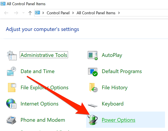- Ensure you’re viewing it in Large icons mode. Click on the Power Options link.