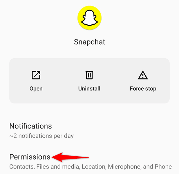 - Open **Settings** on your phone. * Navigate to **Apps & notifications** > **Snapchat** in Settings. * Tap **Permissions** on Snapchat’s app page.
