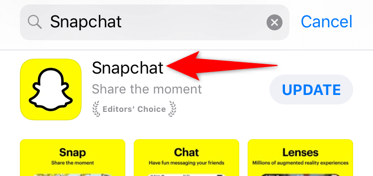- Tap **Delete** in the prompt to confirm your choice. * Open the **App Store**, search for **Snapchat**, and tap **Snapchat** in the search results.