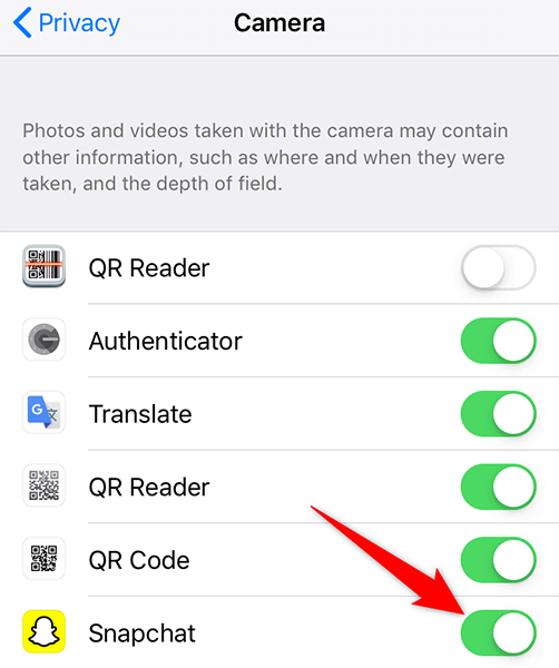 - Turn on the Snapchat toggle to allow the app to use your phone’s camera.