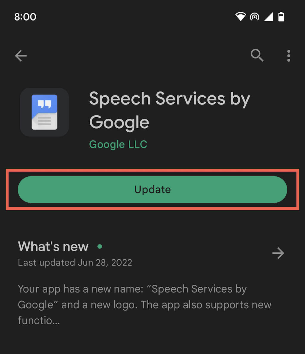 Make sure you’re running the latest version of Speech Service by Google. To do that, search for Speech Service by Google in the Google Play Store and tap the Update button if you see the option.