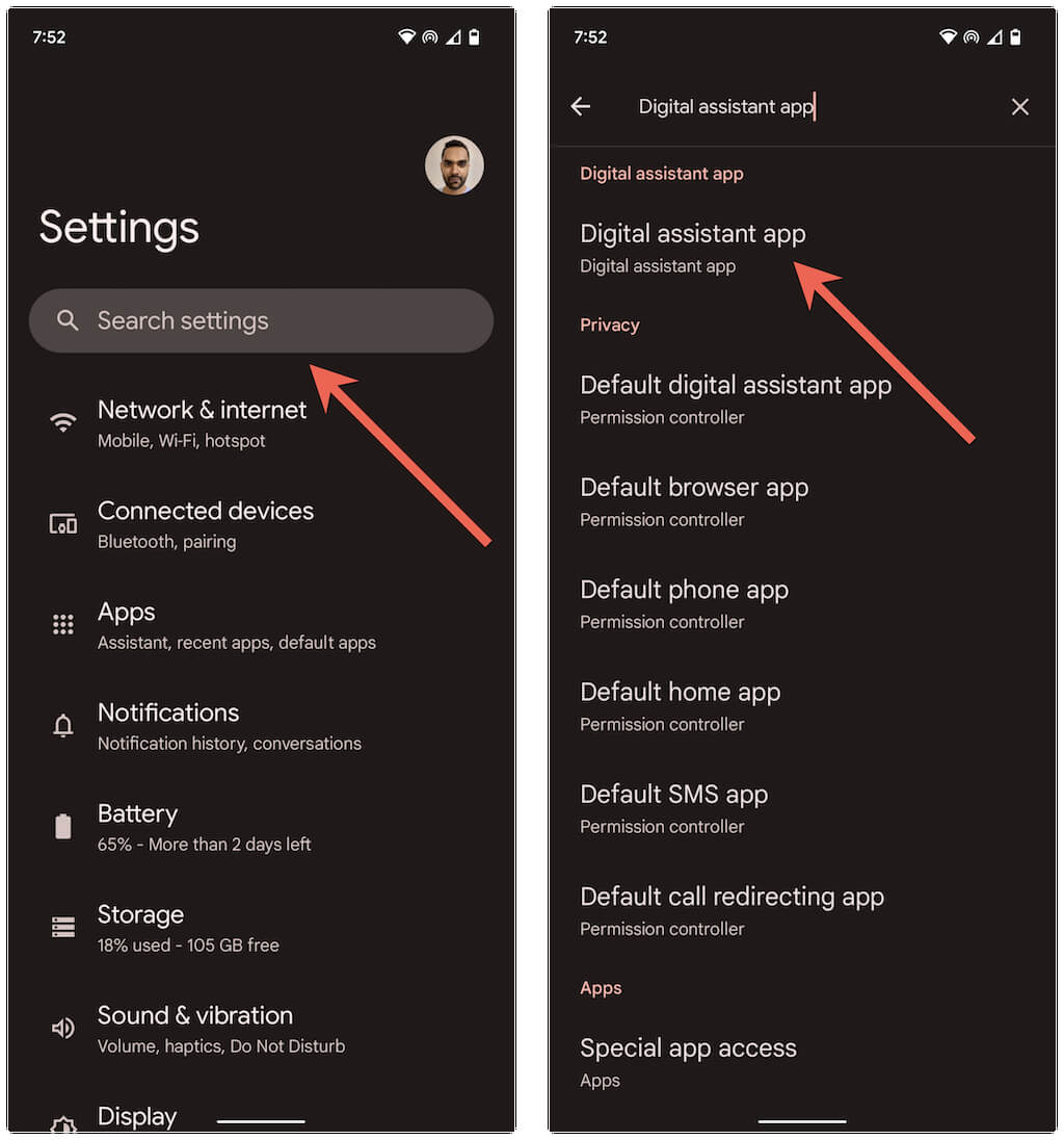 Head back to the previous screen and tap the Settings icon next to the Default digital assistant app.