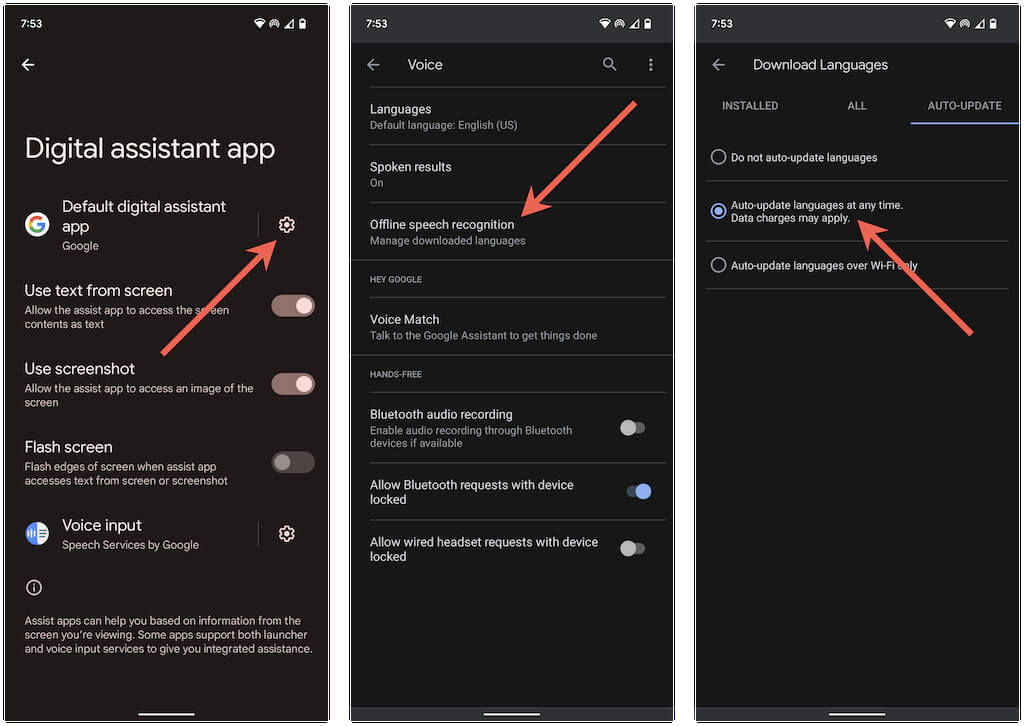 Note: To double-check, open the Google app, tap your profile portrait, and select Settings > Voice > Speech Recognition. Then, select any pending updates under the Installed. That should prompt your Android device to download them.