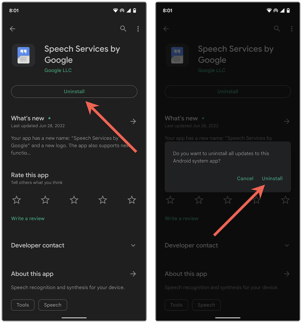 Still no luck? Consider removing and reinstalling all Speech Services by Google updates. Again, search for Speech Service by Google on the Play Store. Then, tap the Uninstall, then Uninstall again to confirm. Next, tap Update to re-install all updates.