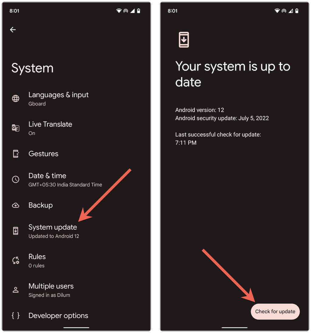 The “Waiting for network connection” Google speech services error might result from an underlying issue with the system software on your Android device. Install the latest Android system updates and check if that fixes the problem.