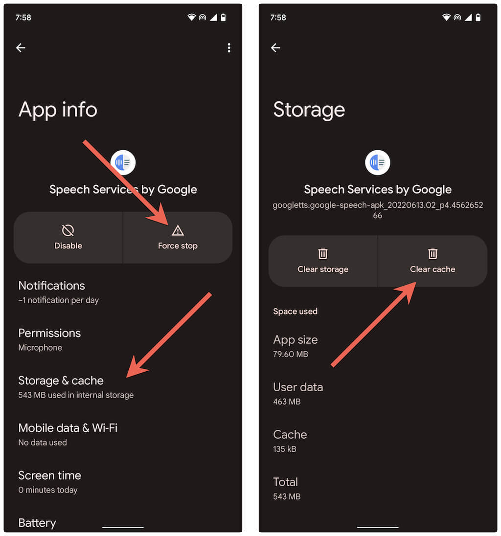Tap Force stop to shut down all background processes related to Google’s speech services. Then, tap Storage & cache.