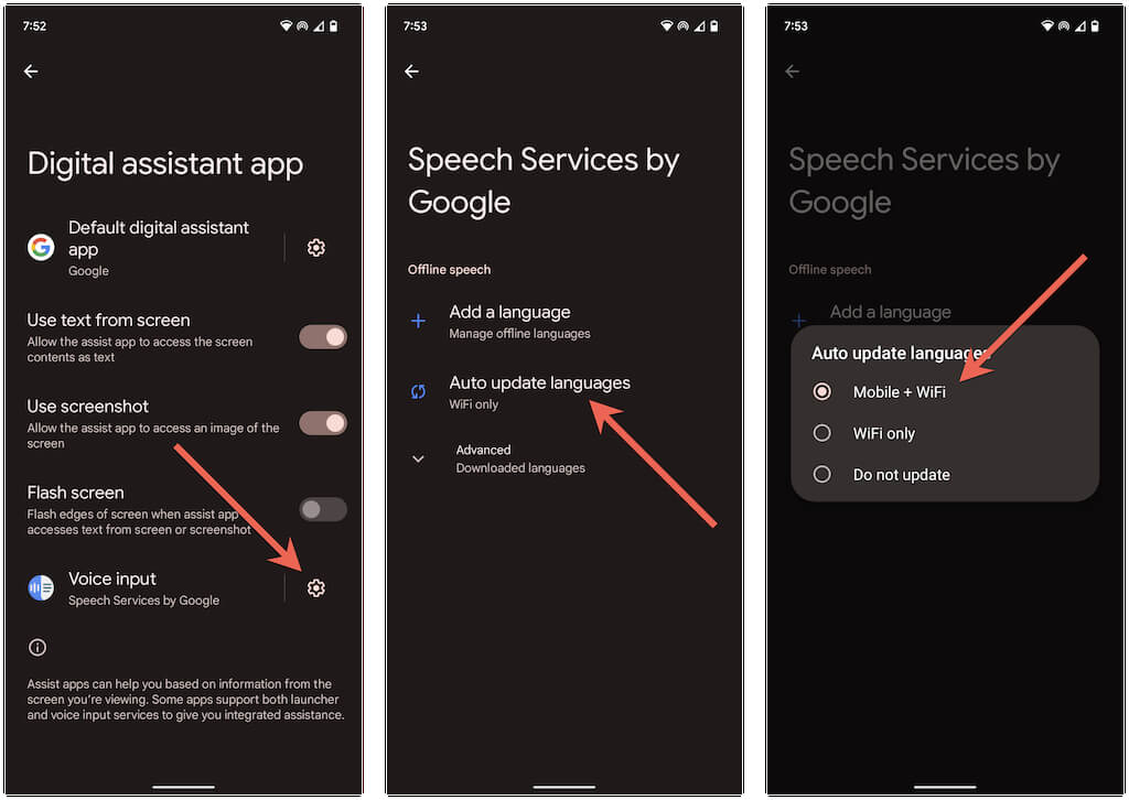 Review your Android’s Google Assistant settings and make sure that Speech Service by Google has permission to auto-update languages over Wi-Fi and mobile data.