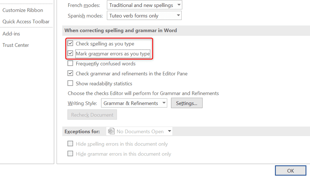 - Enable both **Check spelling as you type** and **Mark grammar errors as you type** options on the right pane.