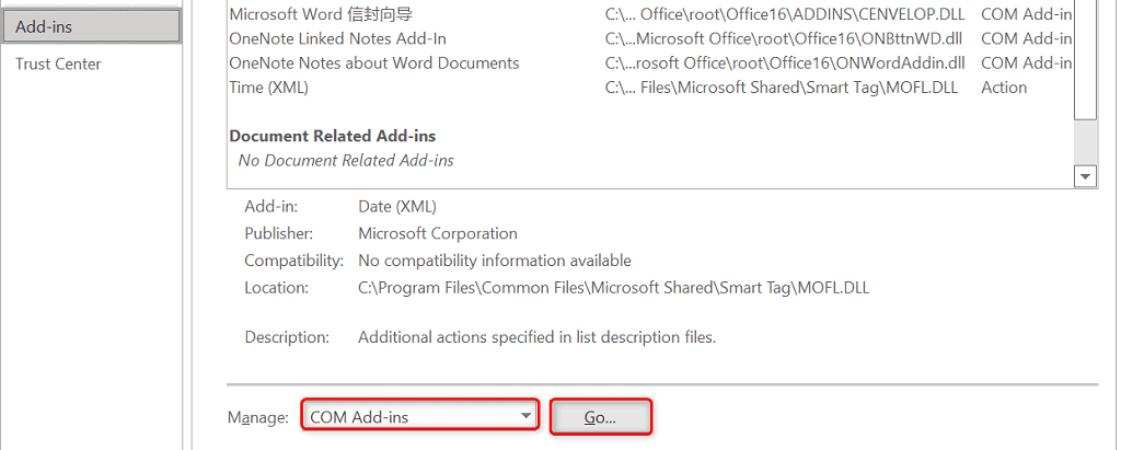 - Open your document in Word and see if your spell and/or grammar issues are highlighted. Your add-ins are likely the culprit if the built-in spell checker is working. * Review your add-ins list by first closing and reopening Word in normal mode, and then choosing **File** > **More** > **Options**. * Select **Add-ins** from the sidebar on the left. * Choose **COM Add-ins** from the **Manage** drop-down menu on the right. Then, select **Go**.
