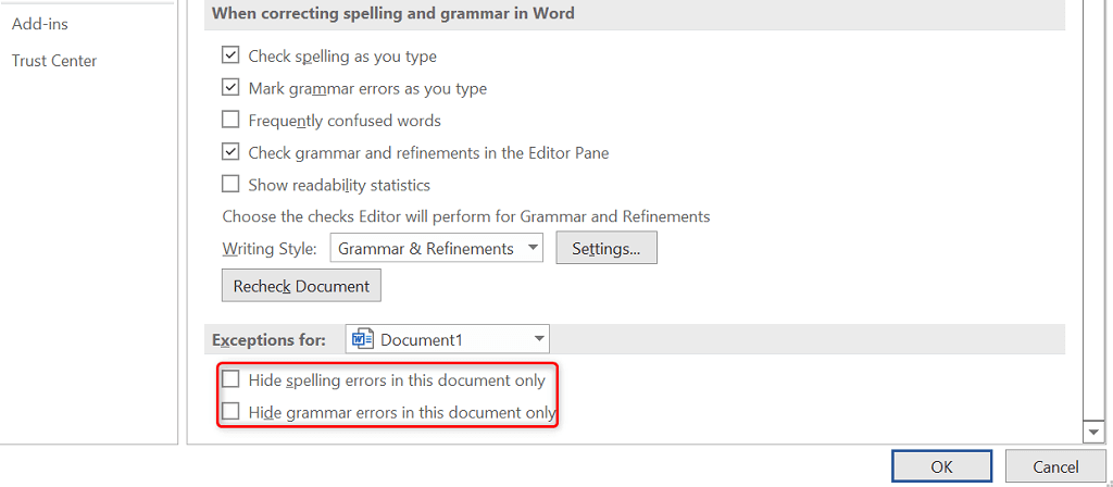 - Deselect both Hide spelling errors in this document only and Hide grammar errors in this document only options.