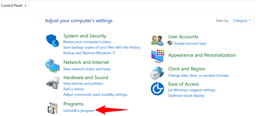 - Select Uninstall a program on the Control Panel window. (Don’t worry, you aren’t uninstalling anything.)