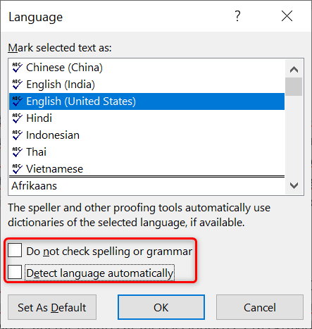 - Select the language your text uses in the dialog box that opens. * Uncheck both **Do not check spelling or grammar** and **Detect language automatically** boxes.