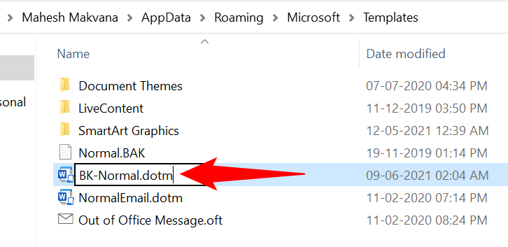 - Right-click the **Normal.dotm** file and choose **Rename**. * Type **BK-Normal.dotm** as the new name and press **Enter**.