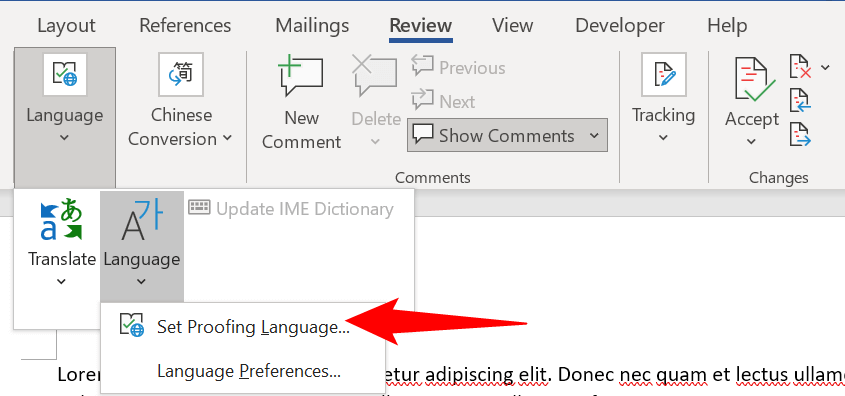 - Access the Review tab from the ribbon at the top. Then, choose Language > Language > Set Proofing Language.