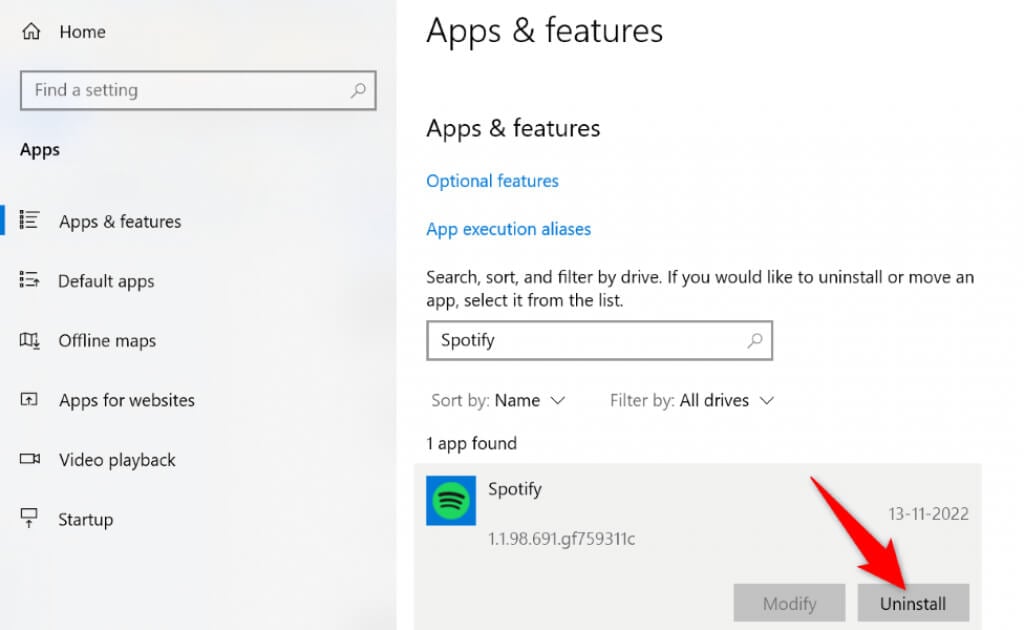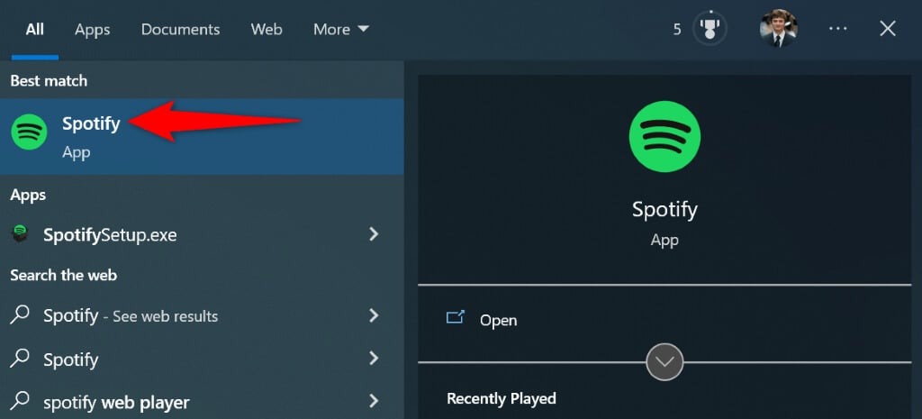 Then, you can relaunch the app by opening the Start menu, searching for Spotify, and selecting the app in the search results.