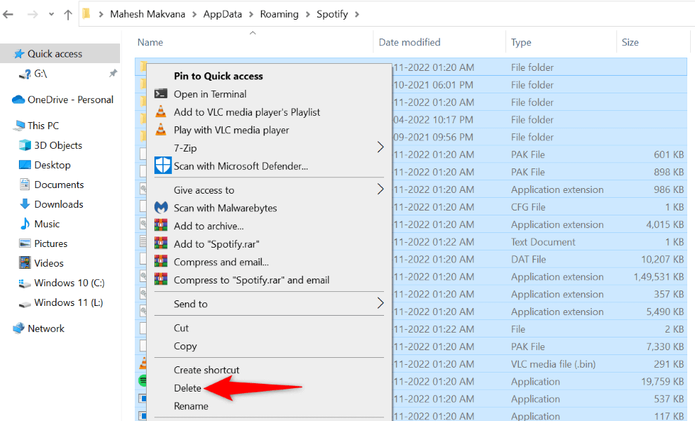 - Access the Spotify folder. * Select all files by pressing Ctrl + A. * Right-click a file on the list and choose Delete.