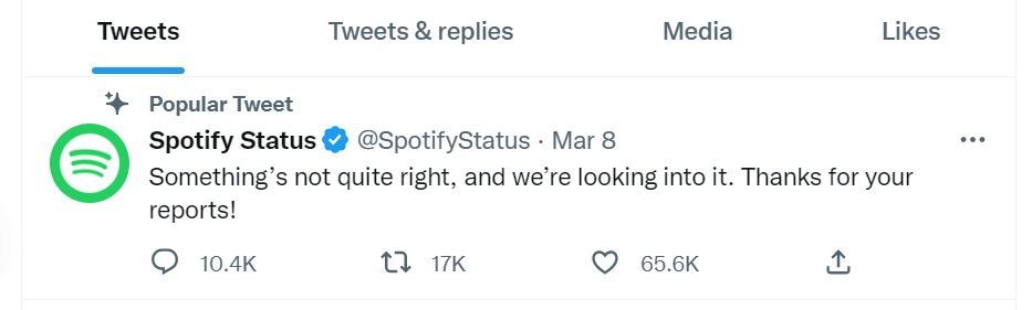 You can verify Spotify’s server status by heading to the Spotify Status account on Twitter. The company alerts users when one or more platform features are experiencing problems.