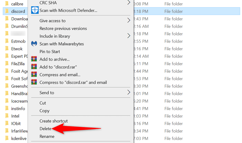 - Find **discord** in File Explorer, right-click the folder, and choose **Delete**.